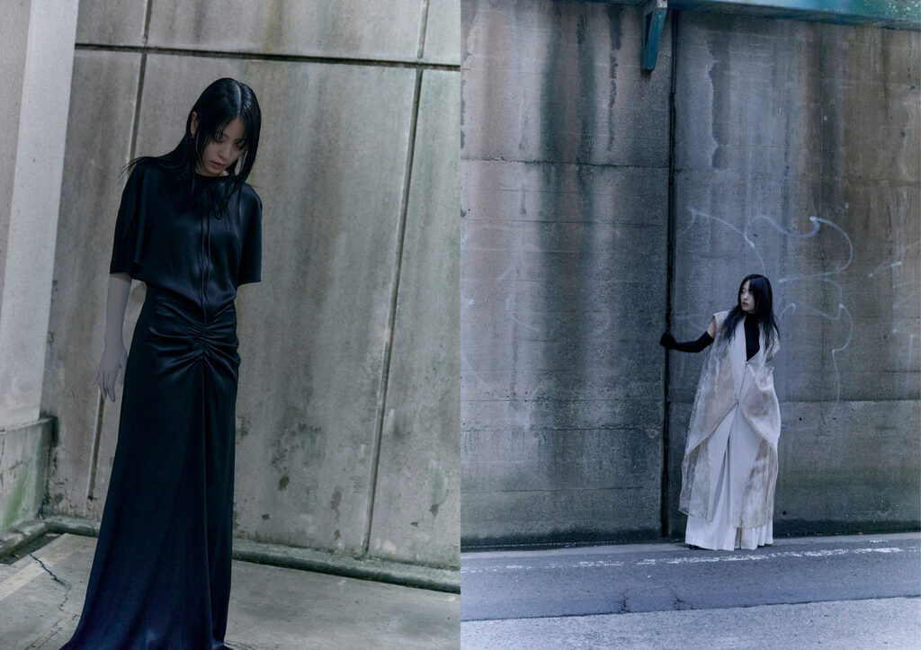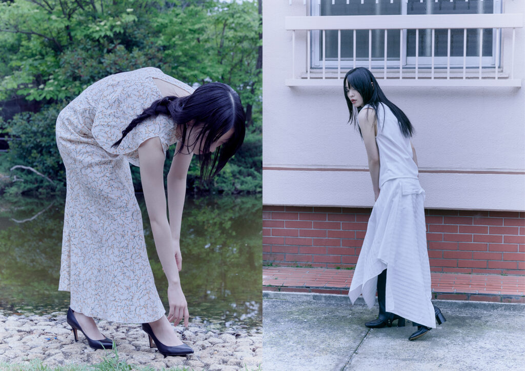 Dress by Victoria Beckham, shoes by Sellenatela. Top and skirt by Yohei Ohno, shoes by Sellenatela, shoe parts stylist’s own. Photography by Rikuto Uchiumi, fashion by Yuki Yamane, hair by Haruto Tanaka, make up by Miyabi and modeling by Kureha.