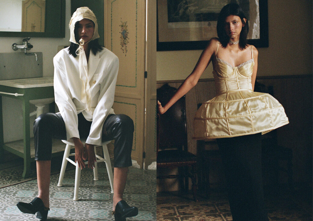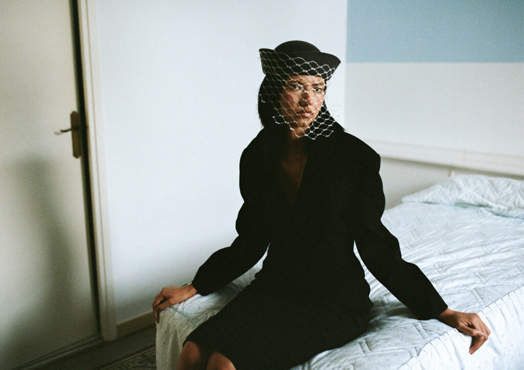 Hat by Ana Tomás, blazer by Vera Pelle, pants by Moirai Market and shoes by Guy Laroche. Dress and choker by Sensum and vintage skirt.