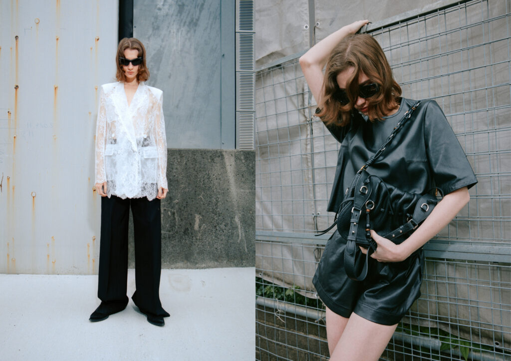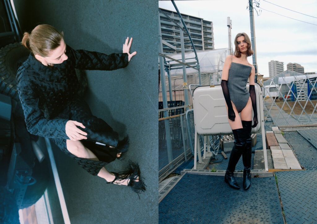 Jacket, skirt by Opera Sport, shoes by Stylist’s own. Bodysuit by Acne Studios, boots by Saint Laurent, gloves by Laura Daili. Photography by Ivana Micic, fashion by Anna Odate, hair by Asahi Sano, make up by Mio Iguchi and modeling by Ceren@Stage Models Tokyo.
