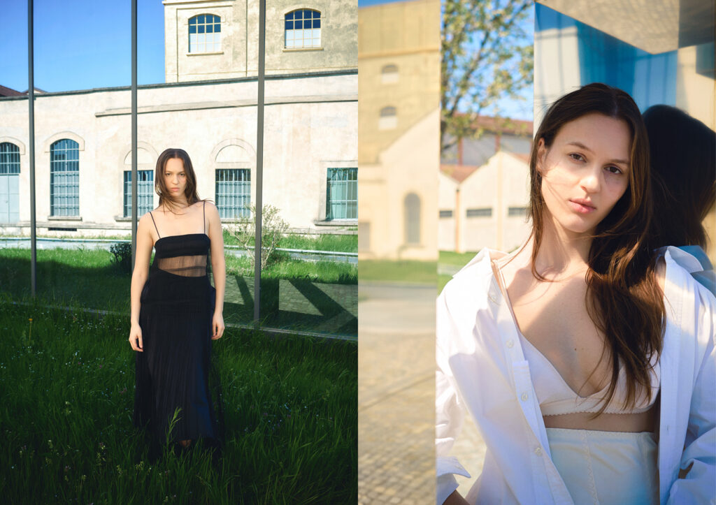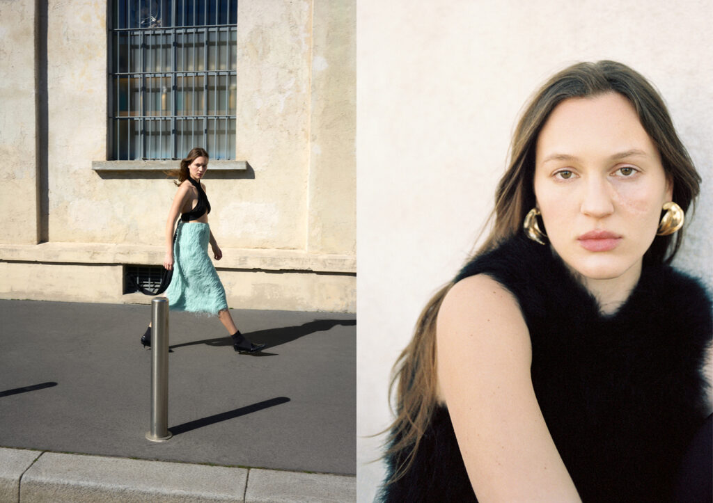 Top and earrings by Zara, skirt by Jil Sander, boots vintage. Blouse by Alexander Wang, bra vintage, pants by Wolford, shoes by Gucci. Photography by Theresa Lou, fashion by Valeria Mediani, hair and make up by Monica Crosta and modeling by Elena Nocciolini @Coma Casting.