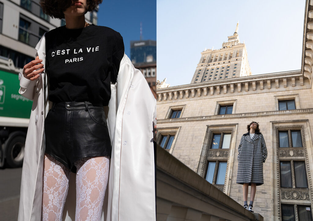 T-shirt vintage, shorts by Mimika, coat by A LOT, leggings by Fiore. Coat by A LOT, socks by Gabriella, shoes by Luca Grossi. Photography and fashion by Ewa Michalik, modeling by Levitt Candence @nevamodels.